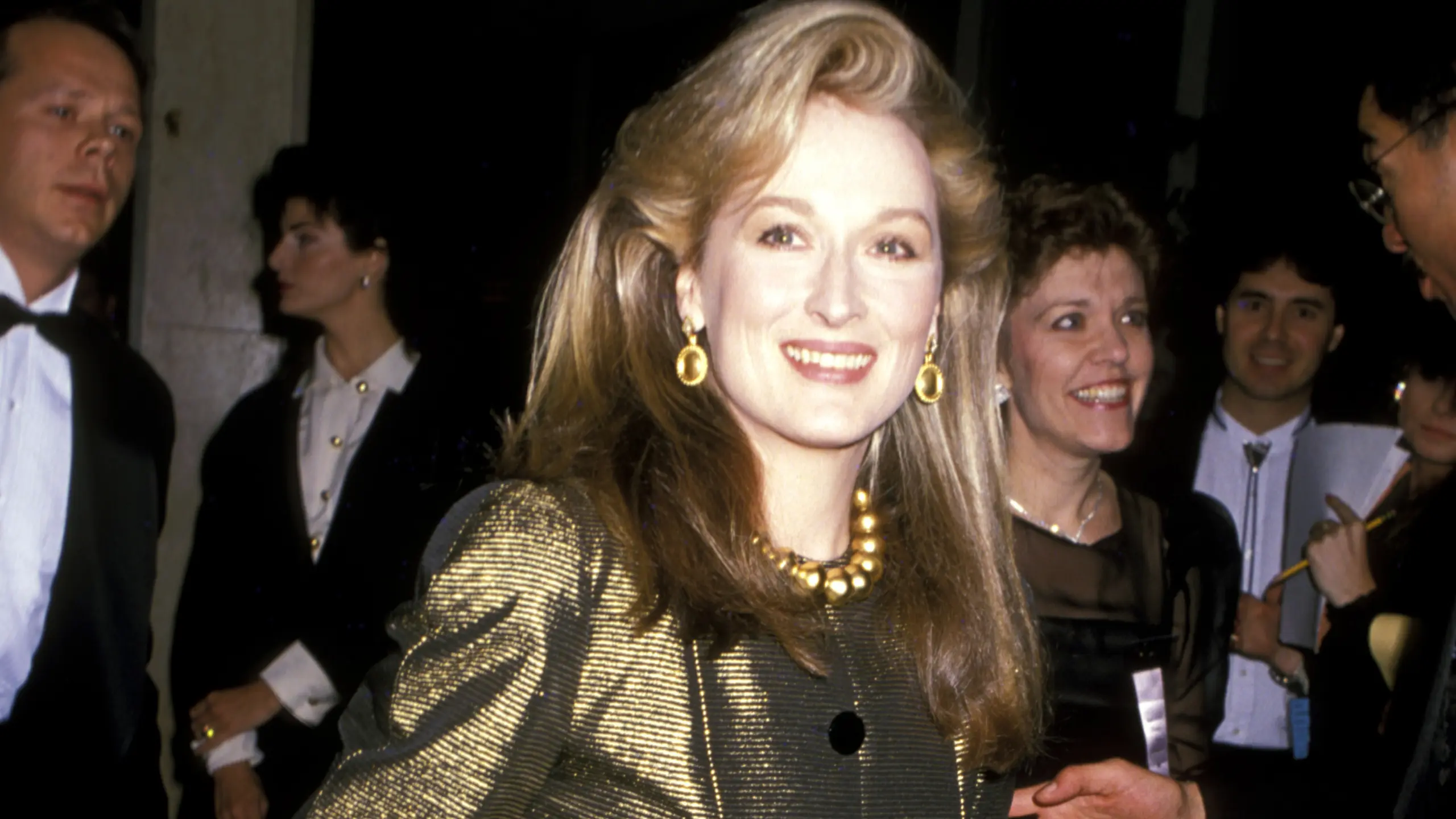 1989’da 46. Golden Globe Ödülleri’ne katılan Meryl Streep, dönemin ışıltı anlayışını abartıya kaçmadan yorumlayan isimlerden biri oldu. Altın tonlarındaki takımı, 80’lerin karakteristik omuz vurgularını incelikli bir kesimle dengeledi. Büyük düğmeler, vücuda oturan ceket formu ve bileğe doğru daralan kollar, görünümün mimarisini güçlendirdi. Eldiven ve çanta gibi aksesuar seçimleri ise stilin tamamlayıcı unsurları olarak öne çıktı. Streep’in bu görünümü, altının yalnızca bir gece elbisesiyle değil, güçlü bir takım silüetiyle de etkili olabileceğini gösterdi.