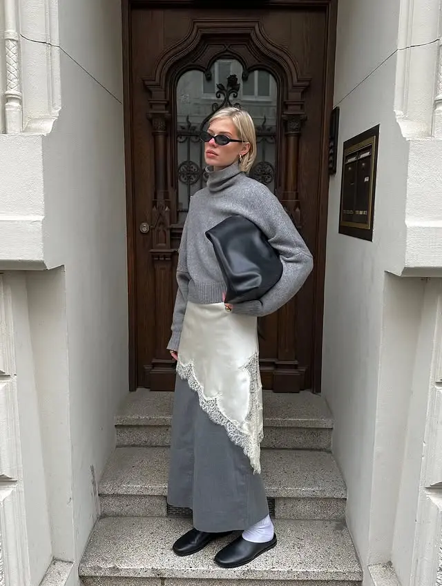 Dantelin bele bağlanarak kullanılması, kemerin yarattığı siluet etkisini daha rafine bir yorumla öne çıkarırken; gömleğin bele bağlanması, katmanlı görünümü stil sahibi ve kontrollü bir duruşa taşıyor. Bu iki detay, layering’i yalnızca işlevsel değil, bilinçli bir stil tercihi haline getiriyor.