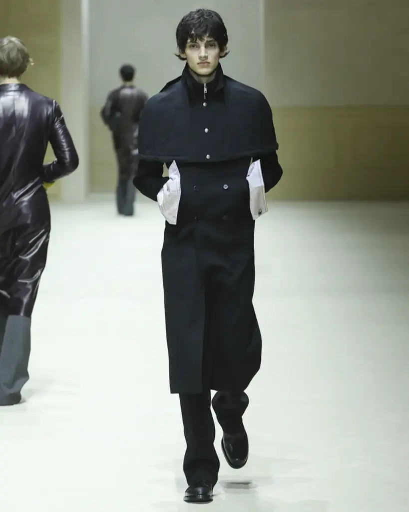 Gabardin trençkotların üzerine eklenen kısa teknik pelerinler, yağmurluk ve yelek formlarından ilham alan üst katmanlar olarak karşımıza çıkıyor. Bu parçalar, paltonun detay uzunluğunu takip edecek şekilde kesilerek, katman fikrini görsel olarak da netleştiriyor. Ortaya çıkan silüet, üst üste giyilmiş ama ağırlaşmamış bir yapı sunuyor; fonksiyonel olduğu kadar görsel olarak da dikkat çekici.
